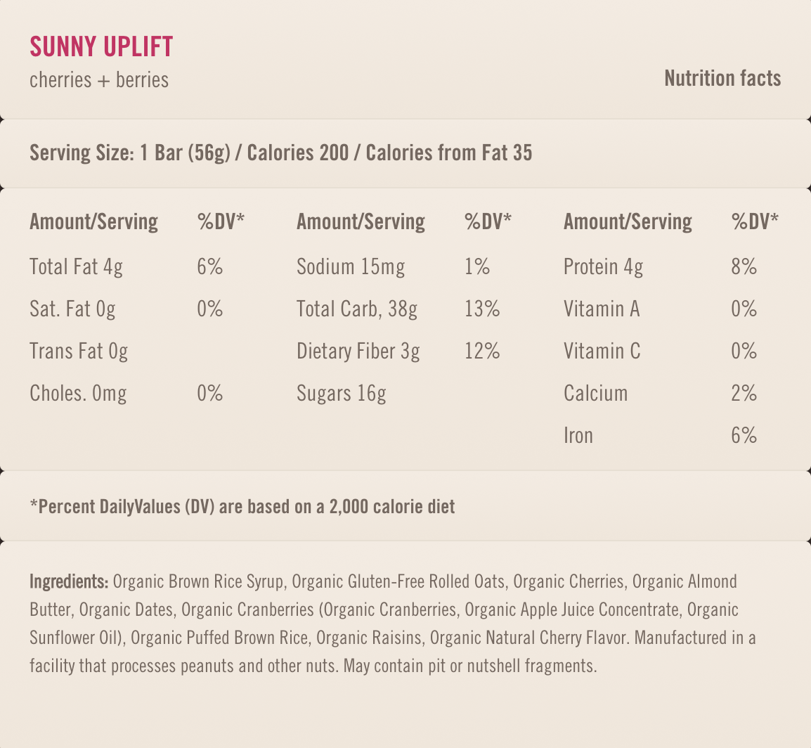 It’s no secret that we’ve all been getting jipped by bars for years. It seems like almost all health/power/breakfast/whatever bars end up having the same amount of fat and refined sugar as an ice cream sundae. This is so not the case with GoMacro. Don’t believe us? Check out the nutritional information for the Cherries + Berries bar: